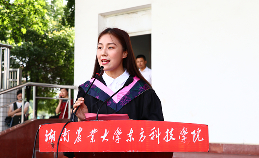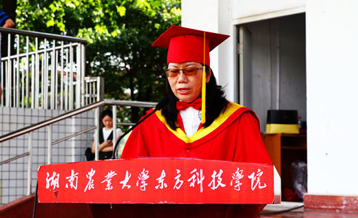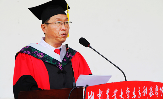 董事长易自力教授为毕业生致辞,他对全体毕业生顺利完成学业、即将踏上新征途表示衷心的祝贺,并向他们的父母、教师表示深深的敬意,同时也表达了对学生未来的希冀:一是要厚德笃学,追求卓越;二是要心怀天下,自强不息;三是要饮水思源,心系母校。他教诲毕业生山再高,往上爬,总能登顶;路再长,走下去,定能到达。最后易教授深情寄语,母校永远是同学们的坚强后盾和心灵家园,并祝全体毕业生前程似锦,平安幸福。