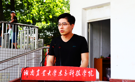 公共课部副主任、英语教研室王帅代表教师发言,他给毕业生们提了几点建议:一是没有无用的知识,只有还不会用的知识,同学们不管身在何处,都要始终抓好学习,并在学习的过程中提高解决问题的能力,磨砺意志品质;二是要学会独立思考,不让碎片化的信息和无关紧要的八卦占满了人生;三是要关心好自己的身体是否健康,心灵是否健康。言语中表达出对毕业生浓浓的不舍和关心。