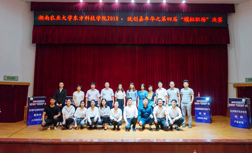 本网讯(招生就业创业指导中心 唐颖)6月13日晚,学院2018▪就创嘉年华之第四届“模拟职场”决赛在学术报告厅举行。长沙绿叶生物科技有限公司人力资源总监童松林、湖南省美佳建筑科技有限公司总经理李永扬、三一重卡人力资源副总监蒋烃、新东方教育科技集团长沙学校招聘总监刘超逸、长沙通程商业行政部人事经理谭瑶、北京银行长沙分行产品经理孙炯担任此次大赛评委。校招生就业处副处长姚文昌老师,学院副院长刘湘辉老师、教务处主任魏坚老师、学部辅导员和300多名学生观看了此次比赛。