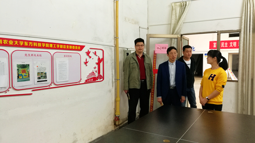 本网讯(党政办  张登高4月18日上午,学院党委书记周跃斌、副书记朱杰辉资产管理与后勤保卫部主任董园、党政办副主任张登高陪同下,深入学院基层党组织检查指导党员活动室建设工作