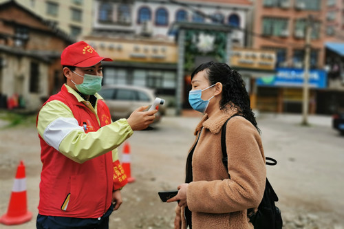 段振晖给过路的居民测量体温