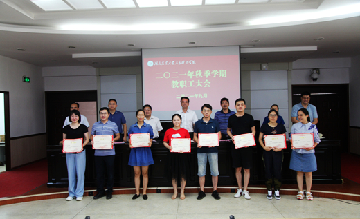 会上对在教育教学、管理服务工作中做出突出成绩的曹小芬等 14 名“优秀教师”,王昭静等 9 名“优秀教育工作者”,王金吉等 4 名“青年教师教学标兵”进行了表彰。会议希望全体教职工坚定信念,立德修身,开拓创新,扎实工作,全力开创学院教育事业新局面,书写学院教育发展新篇章。